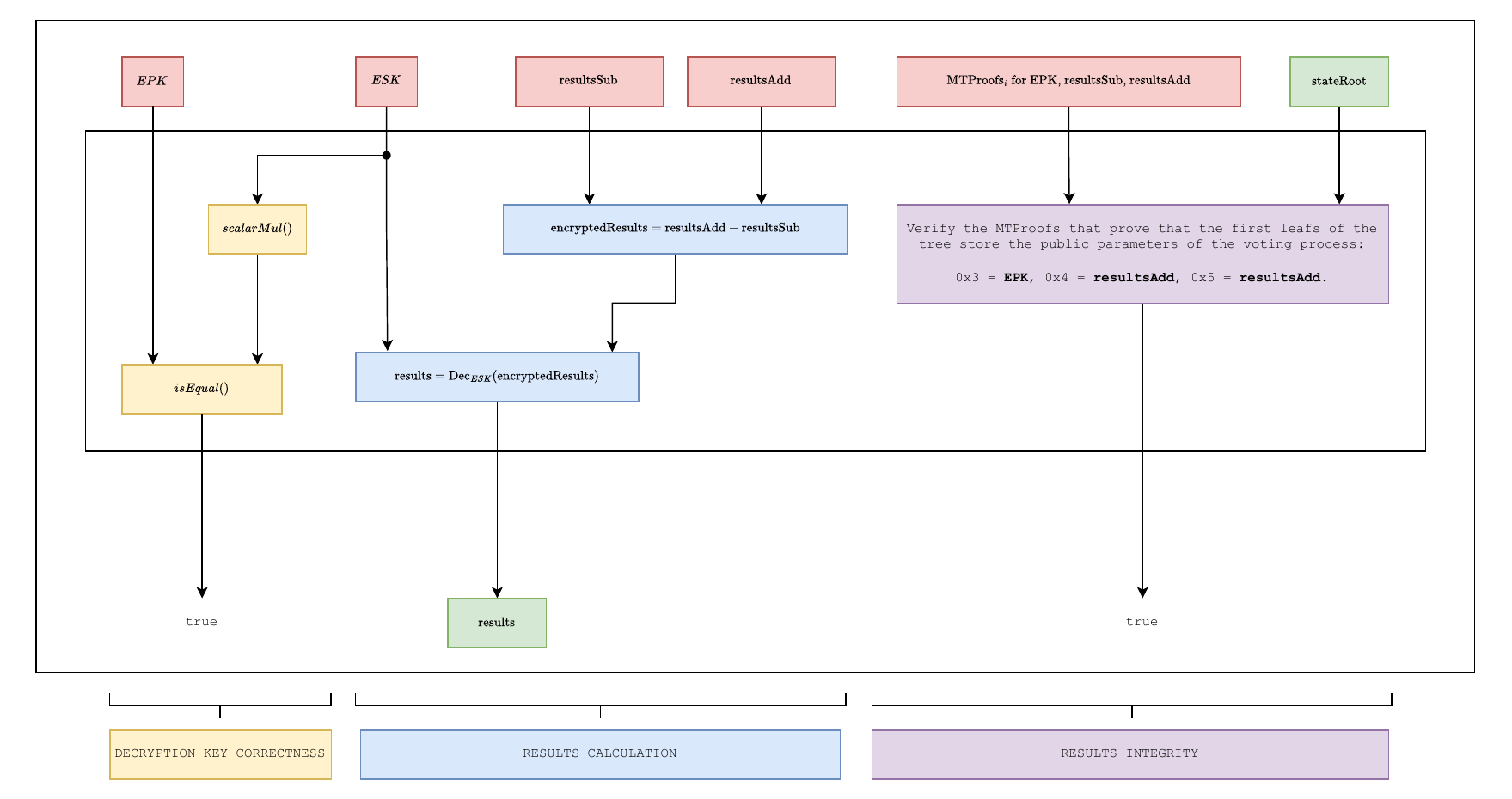 5.  *Election finalization*. The results and a proof of correctness are submitted to the results verification smart contract. The contract verifies the proof, ensuring that the tally has been derived faithfully from the final state. Once this verification succeeds, the results and the latest state root remain available on-chain, providing an immutable record of the election outcome that can be independently audited by anyone.